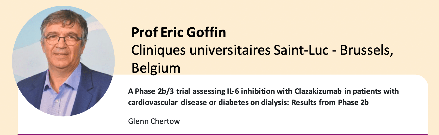 Glen Chertow a présenté des données d’une étude interventionnelle chez des adultes en hémodialyse ayant des antécédents de maladie cardiovasculaire athéroscléreuse et/ou de diabète, et un taux de CRP > 2 mg/L, qui ont été randomisés pour recevoir 3 dosages différents de Clazakizumab, un inhibiteur spécifique de l’IL-6, ou un placebo pendant 24 semaines.