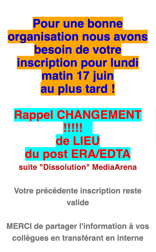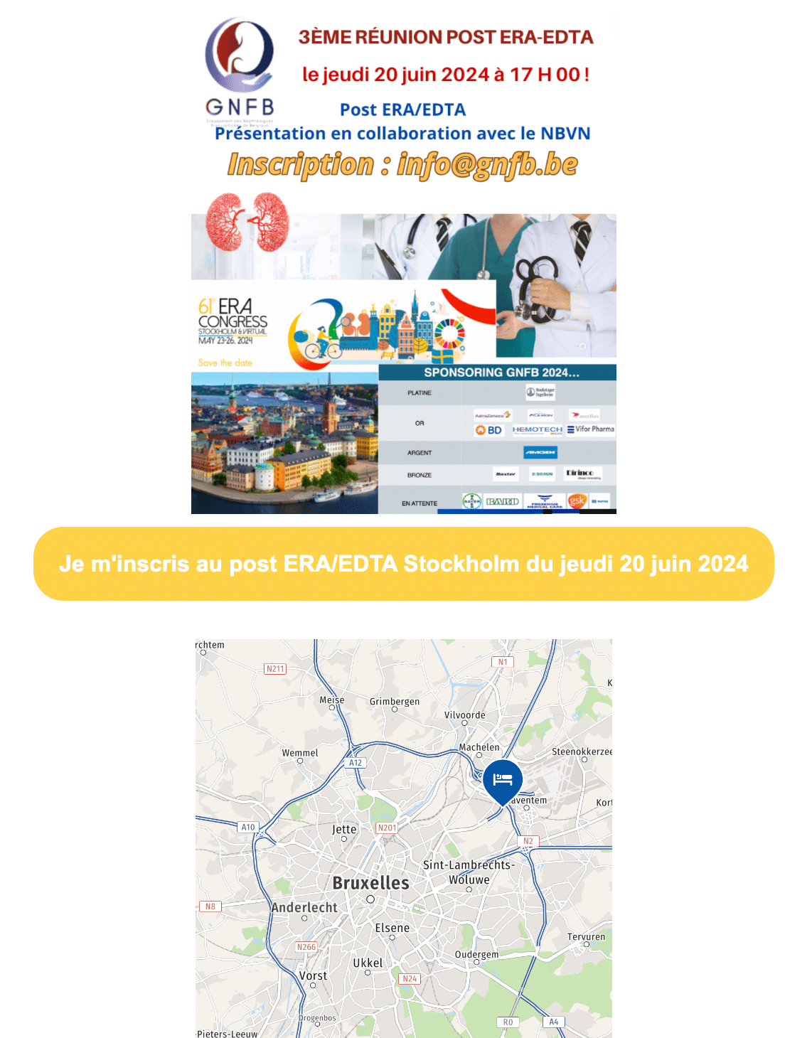 Jeudi 20 juin : POST ERA/EDTA Stockholm GNFB/NBVN . Lien pour vous inscrire: limite le lundi 17 juin + Ajouter à Google Calendar + iCal / Outlook export Date Juin 20 2024 Terminé! Heure 16:00 - 21:30 Catégories Congrès International Congrès National réunion présentielle commune GNFB/BVN Réunion présentielle GNFB Partager cet événement