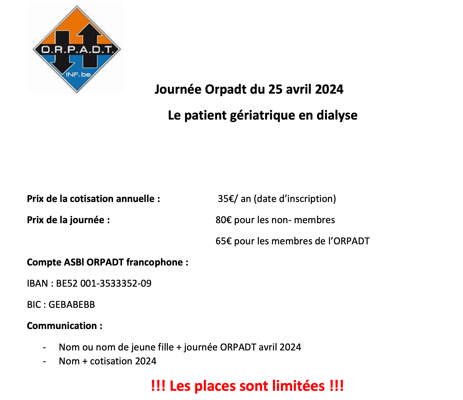 Journée Orpadt du 25 avril 2024 : Le patient gériatrique en dialyse + Ajouter à Google Calendar + iCal / Outlook export Date Avr 25 2024 Terminé! Heure 08:00 - 16:30 Catégories Réunion Orpadt Partager cet événement