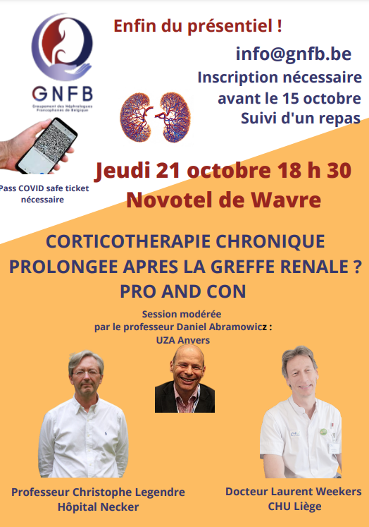 3Oct2021 Author Jean-Marc Desmet Categories néphrologie, Nouveautés, présentation, Transplantation 2 commentaires sur Première réunion en présentiel ce jeudi 21 octobre 2021 : Corticothérapie chronique post-greffe débat pro-con C’es avec grand plaisir que nous vous invitons à nous retrouver pour un débat passionnant suivi d’un repas Corticothérapie (2) Partager PreviousNext 2 Replies to “Première réunion en présentiel ce jeudi 21 octobre 2021 : Corticothérapie chronique post-greffe débat pro-con” Mercken says: 11 octobre 2021 at 08:31 Bonjour je désire m’inscrire aux présentations et au repas du 21/10 Répondre Mercken says: 11 octobre 2021 at 08:32 je souhaite m’inscrire aux présentations et au repas du 21/10 Répondre Laisser un commentaire Annuler la réponse.Your email address will not be published. CommentYou may use these <abbr title="HyperText Markup Language">HTML</abbr> tags and attributes: <a href="" title=""> <abbr title=""> <acronym title=""> <b> <blockquote cite=""> <cite> <code> <del datetime=""> <em> <i> <q cite=""> <s> <strike> <strong> Name * Email * Website Enregistrer mon nom, mon e-mail et mon site web dans le navigateur pour mon prochain commentaire. Δ
