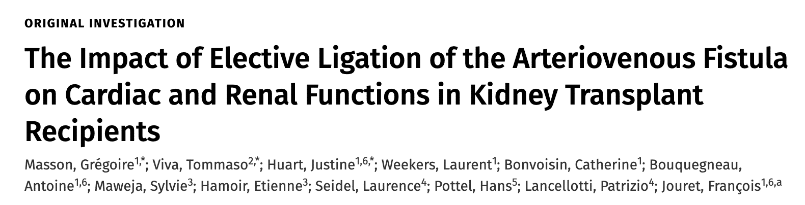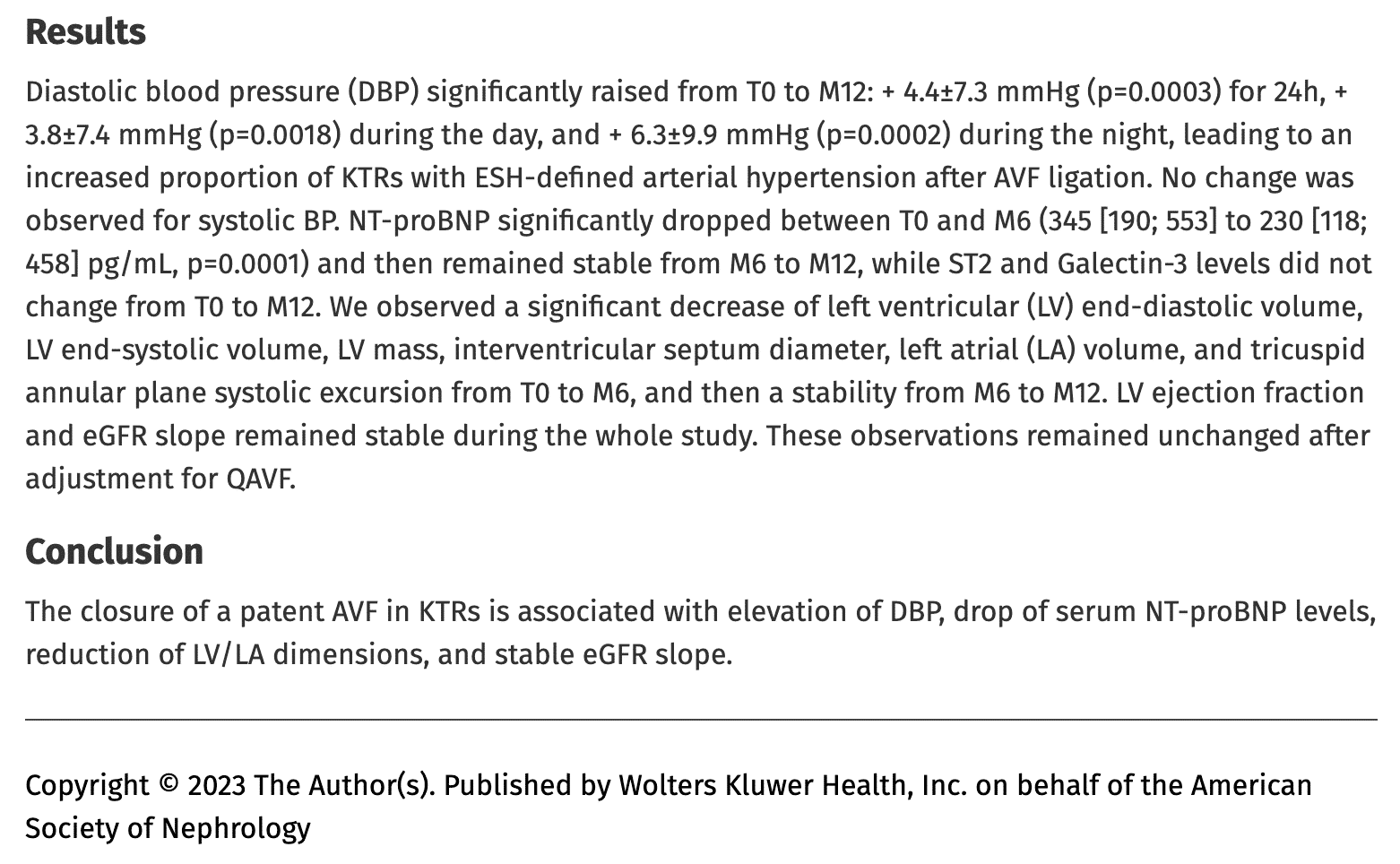 Results: Diastolic blood pressure (DBP) significantly raised from T0 to M12: + 4.4±7.3 mmHg (p=0.0003) for 24h, + 3.8±7.4 mmHg (p=0.0018) during the day, and + 6.3±9.9 mmHg (p=0.0002) during the night, leading to an increased proportion of KTRs with ESH-defined arterial hypertension after AVF ligation. No change was observed for systolic BP. NT-proBNP significantly dropped between T0 and M6 (345 [190; 553] to 230 [118; 458] pg/mL, p=0.0001) and then remained stable from M6 to M12, while ST2 and Galectin-3 levels did not change from T0 to M12. We observed a significant decrease of left ventricular (LV) end-diastolic volume, LV end-systolic volume, LV mass, interventricular septum diameter, left atrial (LA) volume, and tricuspid annular plane systolic excursion from T0 to M6, and then a stability from M6 to M12. LV ejection fraction and eGFR slope remained stable during the whole study. These observations remained unchanged after adjustment for QAVF.