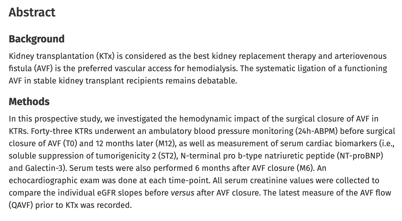 Methods: In this prospective study, we investigated the hemodynamic impact of the surgical closure of AVF in KTRs. Forty-three KTRs underwent an ambulatory blood pressure monitoring (24h-ABPM) before surgical closure of AVF (T0) and 12 months later (M12), as well as measurement of serum cardiac biomarkers (i.e., soluble suppression of tumorigenicity 2 (ST2), N-terminal pro b-type natriuretic peptide (NT-proBNP) and Galectin-3). Serum tests were also performed 6 months after AVF closure (M6). An echocardiographic exam was done at each time-point. All serum creatinine values were collected to compare the individual eGFR slopes before versus after AVF closure. The latest measure of the AVF flow (QAVF) prior to KTx was recorded.